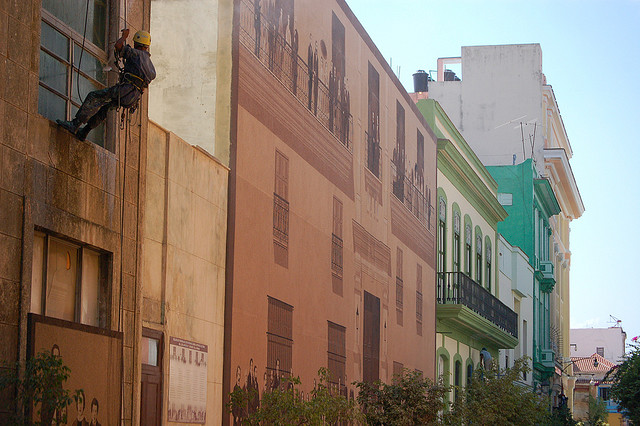Foto de tgraham (CC by-nc/2.0/) - Um trabalhador cubano em operações de manutenção em prédios da Havana Vieja.